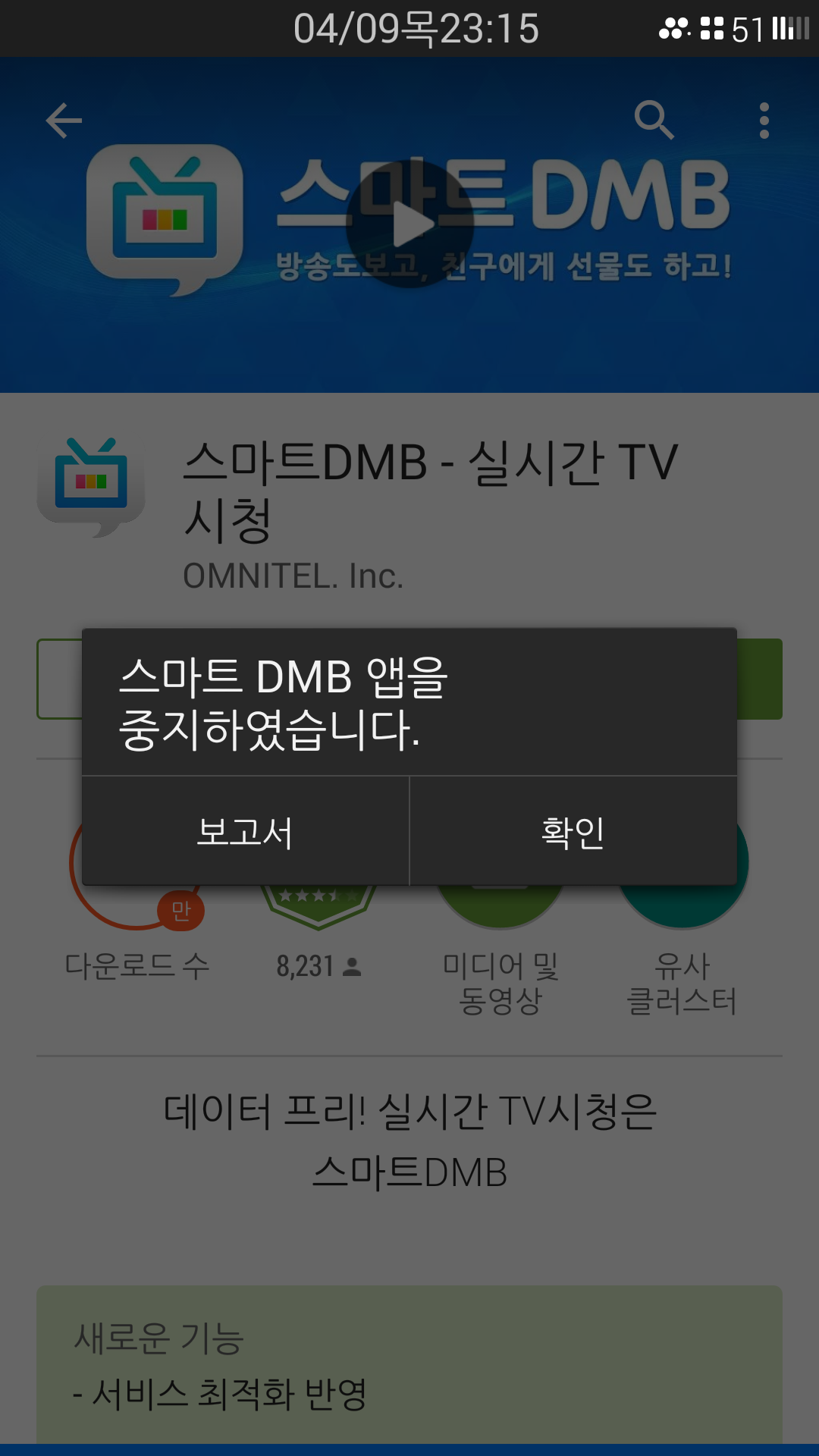 도리없이 업글 하고 나니 사정없이 중지해 버리네요. 초기화도 해 보고 삭제후 설치도 해 보고... 스마트DMB파업중입니다^^;;;